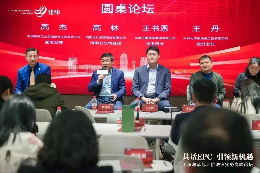 黄河勘测规划设计研究院有限公司法务及知识产权部主任、高级经济师秦静;中国化学工程第十一建设有限公司法务部长董向东;中国通号交通建设有限公司河南分公司总经理金鲁豫;中铁十一局集团河南分公司总经理程实;郑州一建集团有限公司副经理王磊;中国机械工业第四建设工程有限公司副总经理高杰;同圆设计集团股份有限公司河南分公司经理高林;河南五建建设集团有限公司法务部长王书恩;中石化河南油建工程有限公司法务经理李莉;中石化中原石油工程设计有限公司秦永亮。各位专家展开热烈讨论,从不同角度发表了自己的观点。