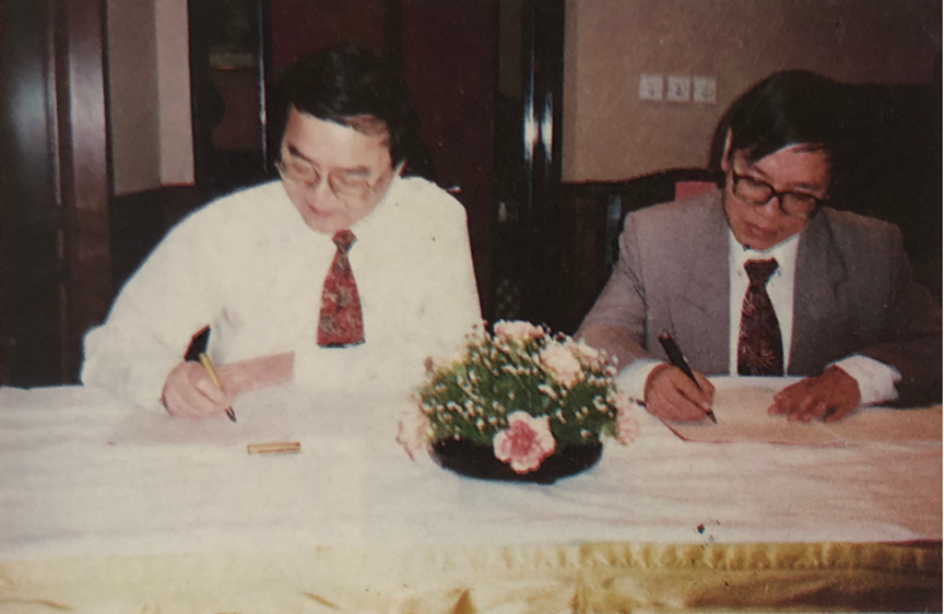 ▲朱树英律师(左)与当时的中共上海市建委书记李春涛(中)、时任市府副秘书长建委主任吴祥明(右)在研讨会上。