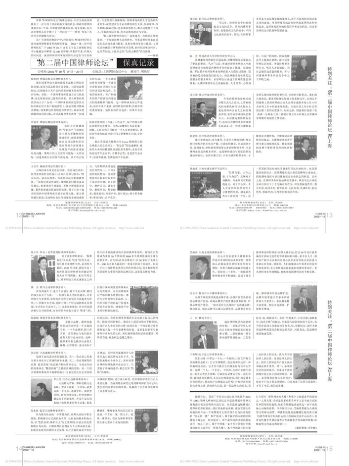 “第二届中国律师论坛”于2002年10月19~20日在上海国际会议中心召开,并取得了有目共睹的成功。来自全国20多个省、市、特别行政区以及外国律师事务所的200余位律师同行欢聚于黄浦江畔,就律师的诚信服务、专业定位、专业品牌等问题进行了广泛交流和深入探讨,取得了丰硕成果。