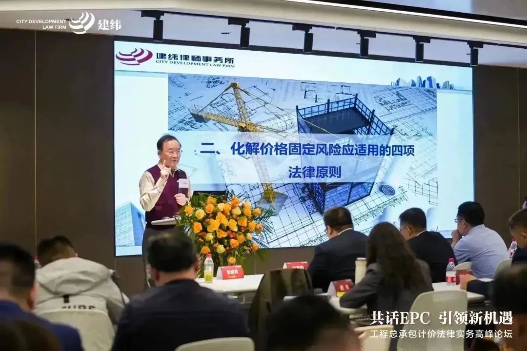 在下午场,建纬研究院院长朱树英莅临现场,以《化解EPC合同固定价格风险应适用的法律原则》为题,条分缕析、抑扬顿挫地向大家分享了EPC合同适用固定价格对总承包人带来的重大风险、化解价格固定风险应适用的四项法律原则等内容,现场掌起了热烈掌声。
