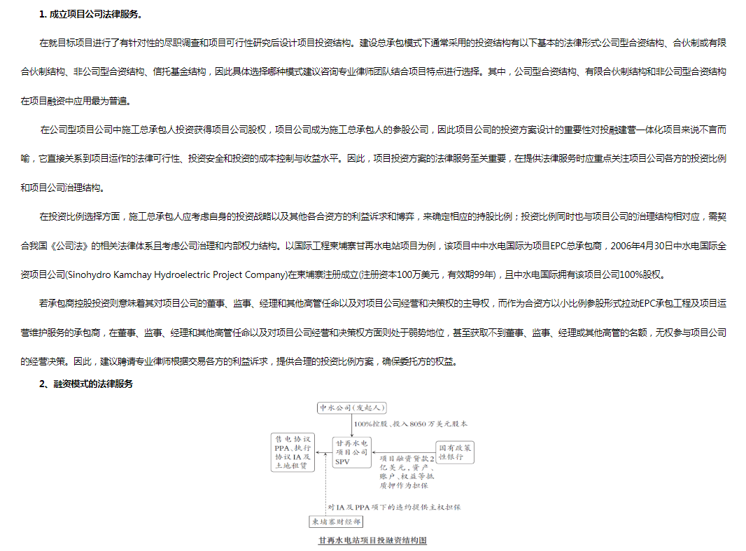 建设总承包模式下全过程法律服务包含前期土地招拍挂、投融资、组建项目公司;建设期的施工履约、竣工验收、工程结算;运营期的运行维护等配套法律服务。全过程法律服务的有效介入可将各环节各项风险及时消灭在萌芽阶段,有效防范法律纠纷和避免法律风险。具体配套法律服务内容如下: