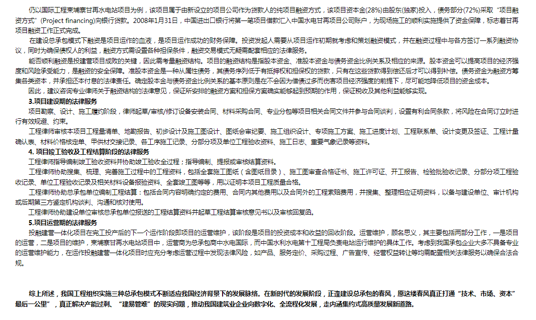 (2)伴随经济发展和城市更新的项目融资需求。经济的高速发展带来了对交通、市政、水务、电力等基础设施的迫切需求,城市基础设施投资需求急剧增加。如F+EPC+O、F+EPC、投资人+EPC、PPP+EPC等建设总承包的具体落地形式应运而生,有效缓解了项目融资压力,既合理利用了社会资源,又引入了市场竞争机制,使业主方得到更具社会化、专业化和商业化的服务。
