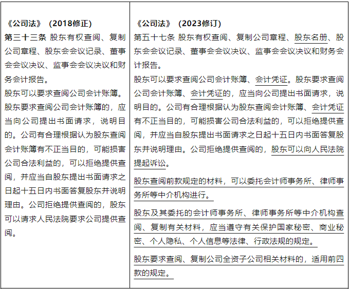 在《公司法》(2023修订)生效之前,关于股东行使知情权的规定为《公司法》(2018修正)第三十三条和《最高人民法院关于适用〈公司法〉若干问题的规定(四)》(下称“《公司法司法解释(四)》”)第七条、第八条和第九条。而《公司法》(2023修订)在2024年7月1日生效后,对有限责任公司股东行使知情权的规定发生了如下变化。