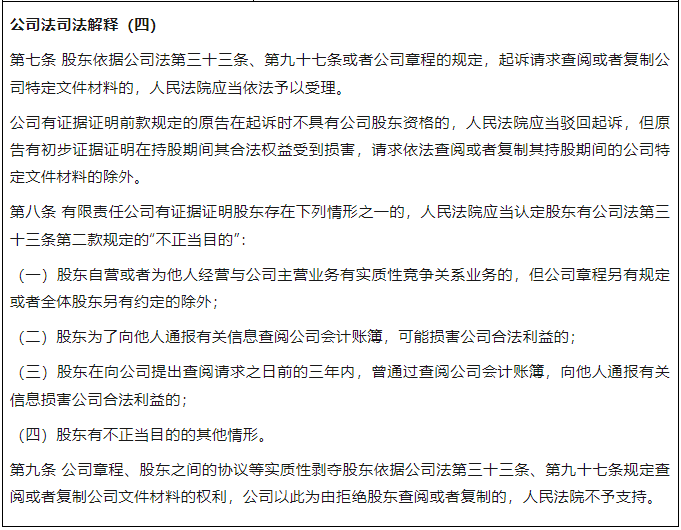 值得关注的是,根据公司法司法解释(四)的第七条、第八条和第九条的内容,原司法解释对于股东行使知情权的相关细节做了具体的规范,如规定了股东失去股东资格情形下能否行使知情权、对“不正当目的”的列举等规定。就此,在《公司法》(2023修订)实施后原公司法司法解释(四)的该等规定是否仍然适用,这一问题尚不明确,在司法实践中可能引发新的争议。