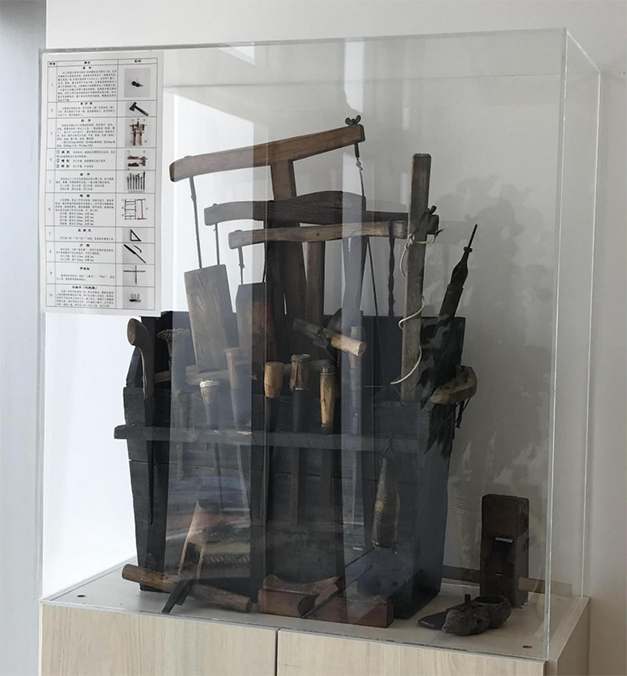 墨斗:木工的墨斗原名叫班母,多用于木材下料。木工最重要的技能是使用、控制好决定横平竖直标准的重要工具墨斗。相传鲁班当日做木工活,正为怎样将木头取直而发愁,忽然看到母亲坐于一旁做针线活,随之灵机一动,忙将长线牵紧于木头之上,后发明了墨斗,名曰:班母。一方面可以用墨斗作圆木锯材的弹线,或调直木板边棱的弹线,还可以用于选材拼板的打号弹线等其他方面。如木板打号或弹线中,墨斗有时还用作吊锤线,衡量放线是否垂直与平整。