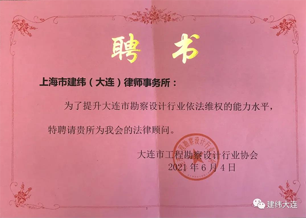 2021年6月4日下午,上海市建纬(大连)律师事务所主任汪丽清、高级合伙人张少泽应邀参加大连市工程勘察设计行业协会四届八次理事会。会议通过了工作报告,确定了换届选举办法和候选人等事项。大连市工程勘察设计行业协会对建纬所的专业性表示认可并颁发聘书,聘请我所为协会的法律顾问。