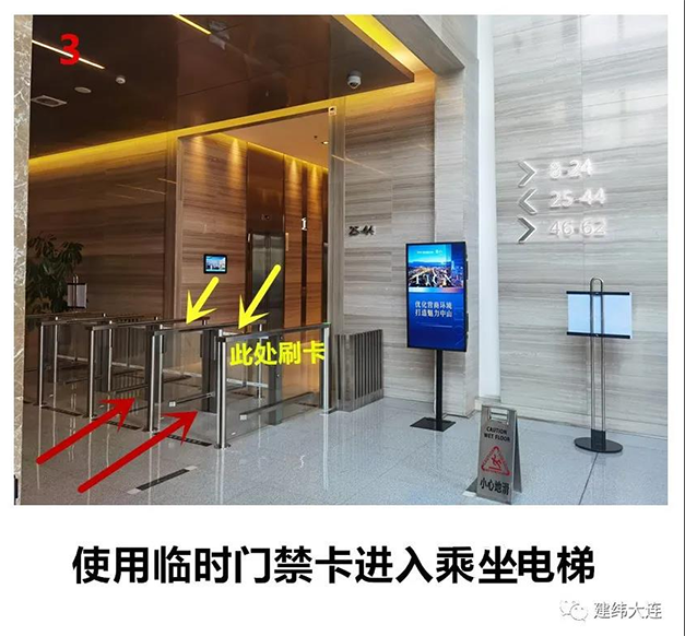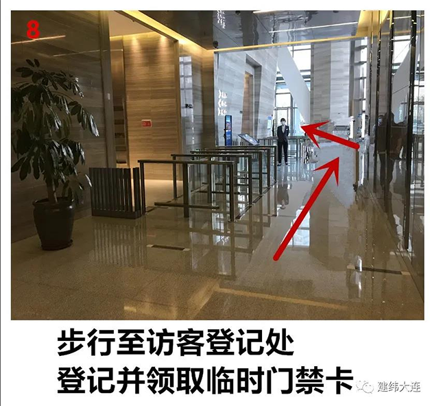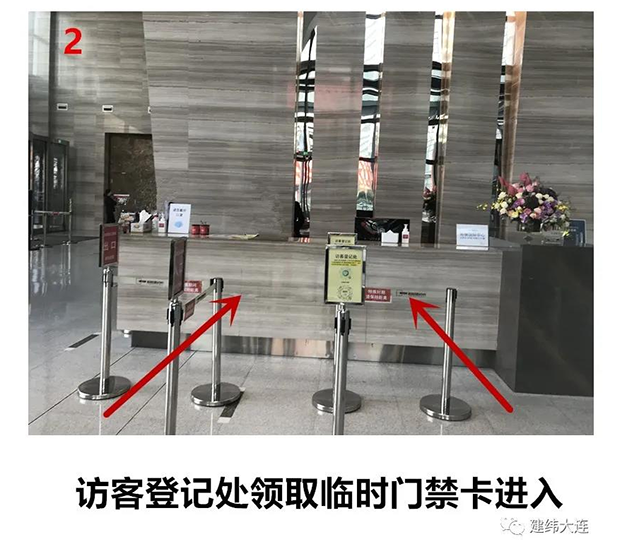 进入一楼大堂后右转,步行至大厅前台进行访客登记并领取临时门禁卡乘坐电梯。
