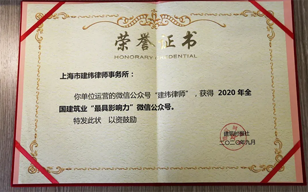 建纬官微诞生6年来,用勤勉和思考,推进城乡发展综合法律服务知识分享;持续发挥专业领域内意见领袖作用,促进行业发展,并获得了行业的认可。2020年9月24日,在《建筑时报》社主办的2020年全国建筑业优秀微信公众号颁奖典礼上,“建纬律师”官微荣获2020年全国建筑业“最具影响力”微信公众号。今年6月份,建纬官微再度入围2021年全国建筑行业优秀微信公众号评选,评选结果将在7月16号揭晓。
