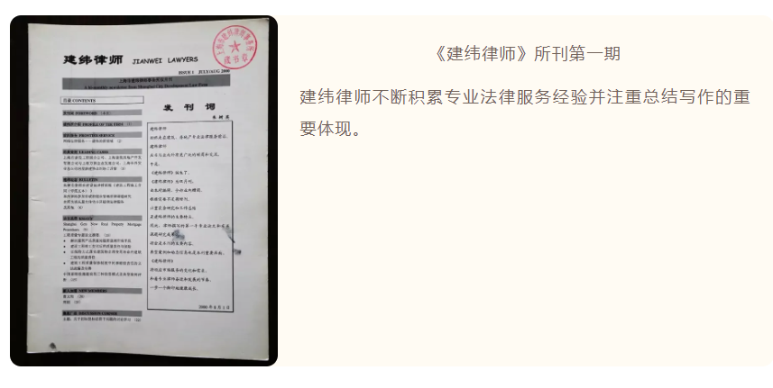 不断积累专业法律服务经验并注重总结写作,这在21年前就已成为建纬重要的专业特色。2000年8月,建纬就创立了自己的双月刊——《建纬律师》,并定期按时出刊,累计出版124期,文章字数超千万,并将其中专业文章归纳结集出版,分别是《房地产开发法律操作实务》和《建设工程法律操作实务》两本精装书。所刊内容涵盖前瞻性的热点、难点法律问题,或者法律服务过程中的新问题,新情况。建纬律师勤于思考,勤于笔耕,事务所逐渐形成律师们动笔、动脑的研究氛围。每一期的写作作品逐渐堆积并积累,成为全体建纬律师的共同知识财富。