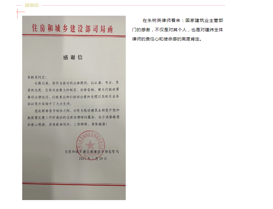 2021年2月,建纬官微报道了建纬所收到来自国家住房和城乡建设部建筑市场监管司的感谢信,信中对建纬所作为法律顾问,一直以来兢兢业业、认真负责为市场司贡献专业智慧,为推动建筑业转型升级和高质量发展作出重要贡献,表示衷心感谢。