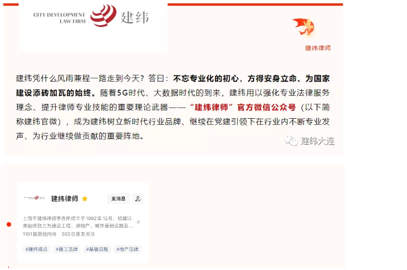 建纬官微定位明确,文章专业实用,动态资讯发布及时,紧扣行业热点。每周定期发布的专业文章内容涵盖建设工程、房地产、自然资源与基础设施、PPP、不动产金融、工程总承包、合规与风控、水项目等专业领域,发表的多篇专业文章被业内媒体转发,为普及建筑行业知识、弘扬法治精神作出重要贡献。